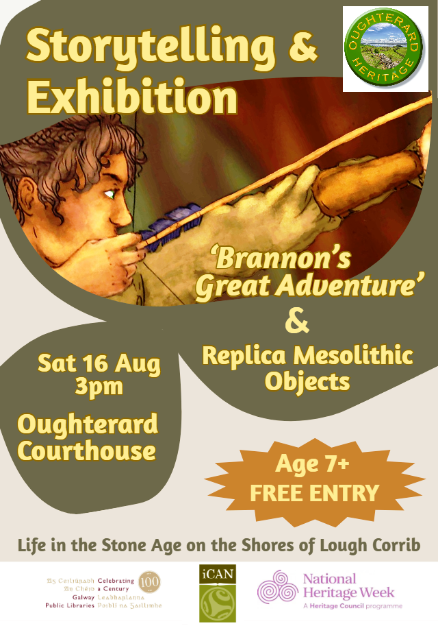 Travel back to the Mesolithic period (8000–4000 BC) with Brannon’s Great Adventure. Enjoy a lively reading of Bill Daly’s children’s story, brought to you by Oughterard Library and Oughterard Heritage Group. Discover how our first settlers arrived on the western shores of Lough Corrib. The Mesolithic replica archaeological material will also be on display for the children to examine.